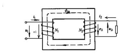 單相變壓器有兩個線圈共同繞在一個閉合鐵芯上,如右圖所示,其中與電源相連的線圈稱為原邊線圈,與原邊線圈相關(guān)的各量的標示符號均在右下角標注以角碼1,如U1、I1等,與負載項鏈的線圈稱為副邊線圈,相關(guān)度額各量的標示符號均在右下角標注角碼2,如U2、I2等。